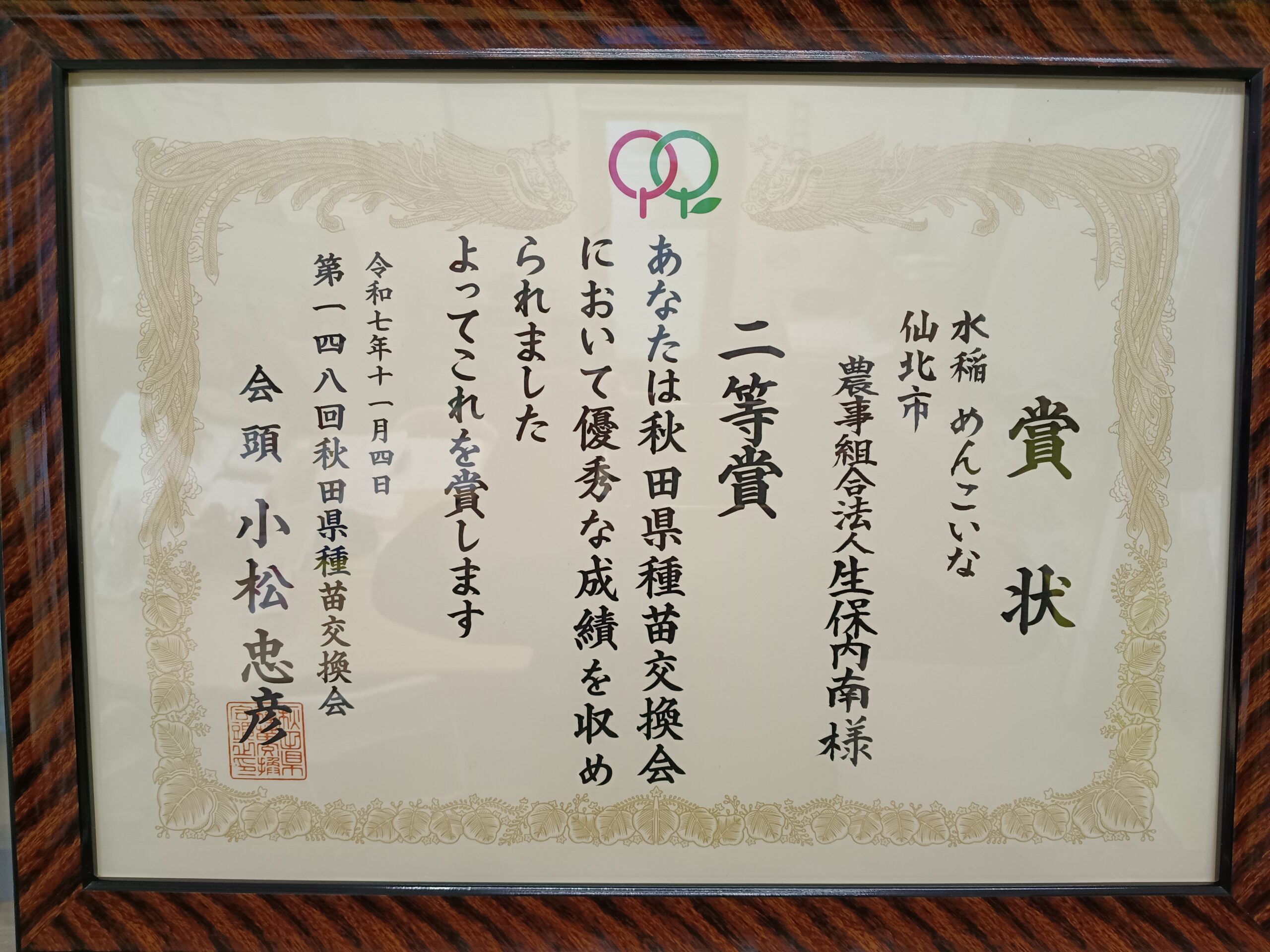 今シーズンの稲刈りも無事終了し、秋田県種苗交換会では二等賞をいただくことができました
