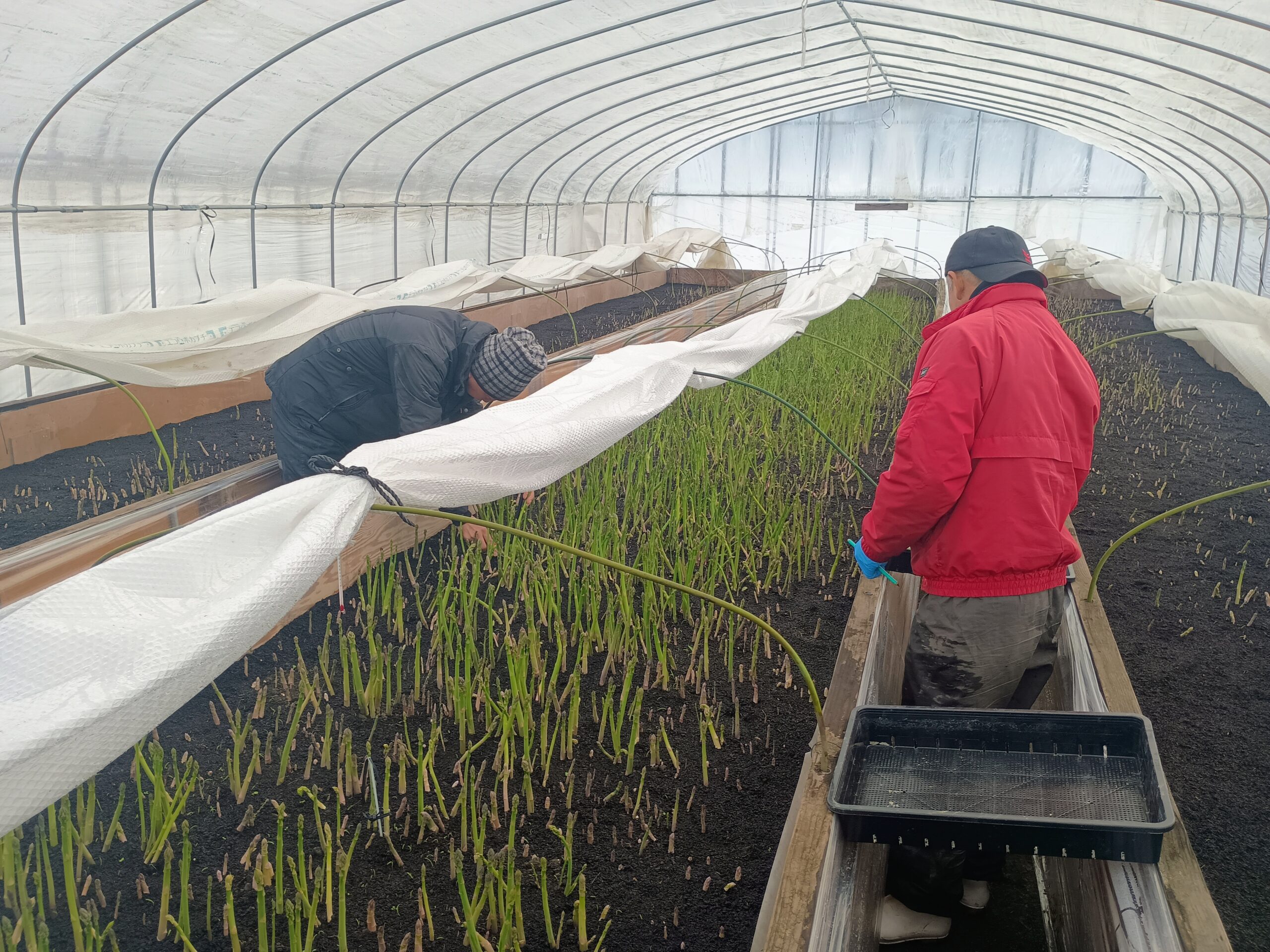 ビニールハウスで栽培したアスパラの収穫が始まりました