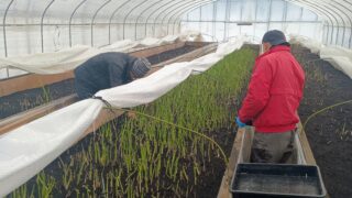 ビニールハウスで栽培したアスパラの収穫が始まりました